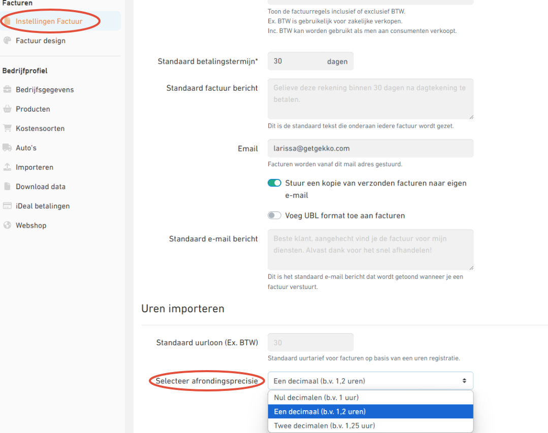 To create accurate invoices, Gekko converts minutes into decimal hours, using a specific number of digits after the decimal point. For example, if you worked for 20 minutes, this is shown as 0.33 hours. You can choose how you want these hours to be rounded. This is especially important when sending invoices.