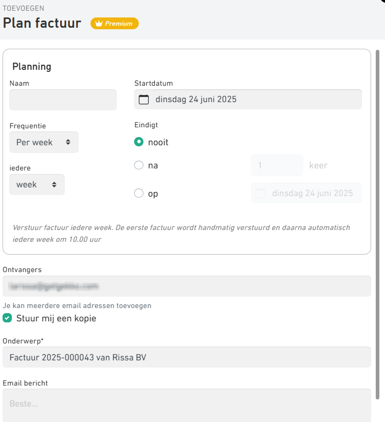 With Gekko Premium, you can schedule invoices to be sent at a later time. This is useful, for example, if you have clients with a subscription and want to automatically send them an invoice each month, or if you simply want to send an invoice on a specific future date.