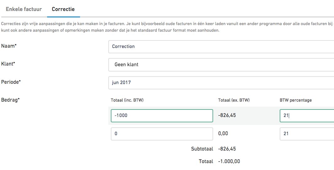 When setting up your correction, make sure your select the same customer. Enter -1000 as the amount, note that by default a correction is including VAT.