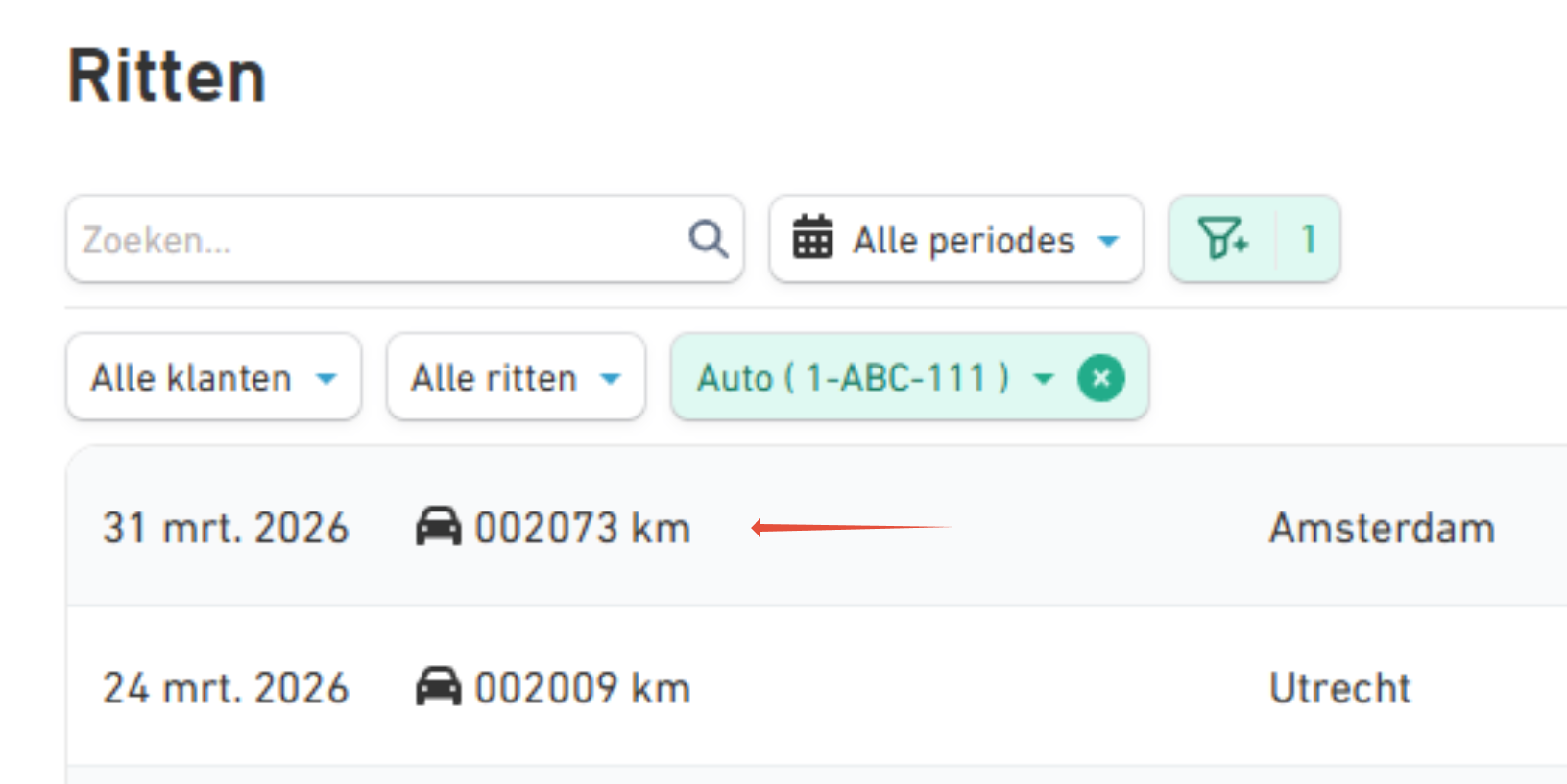 De kilometerstand van van je auto vind je terug bij het rittenoverzicht op de website van Gekko. Naast je meest recente rit van een bepaalde auto vind je de laatste kilometerstand.