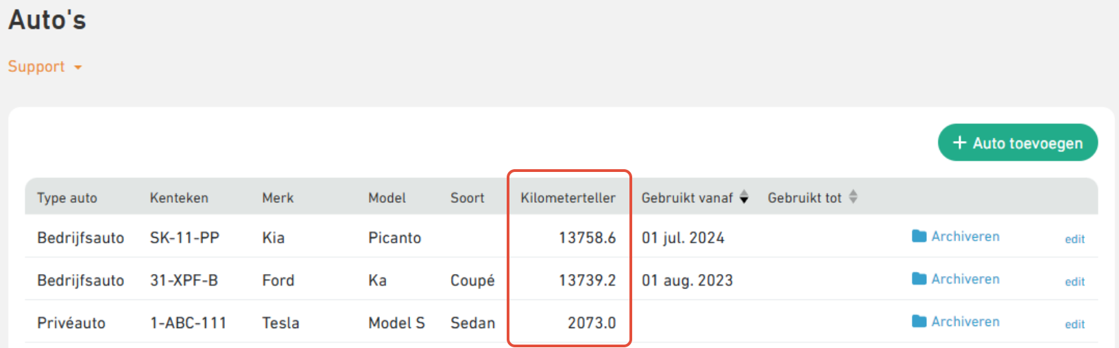 De kilometerstand van al je auto's kun je ook terugzien bij de Auto instellingen pagina van je Gekko account.