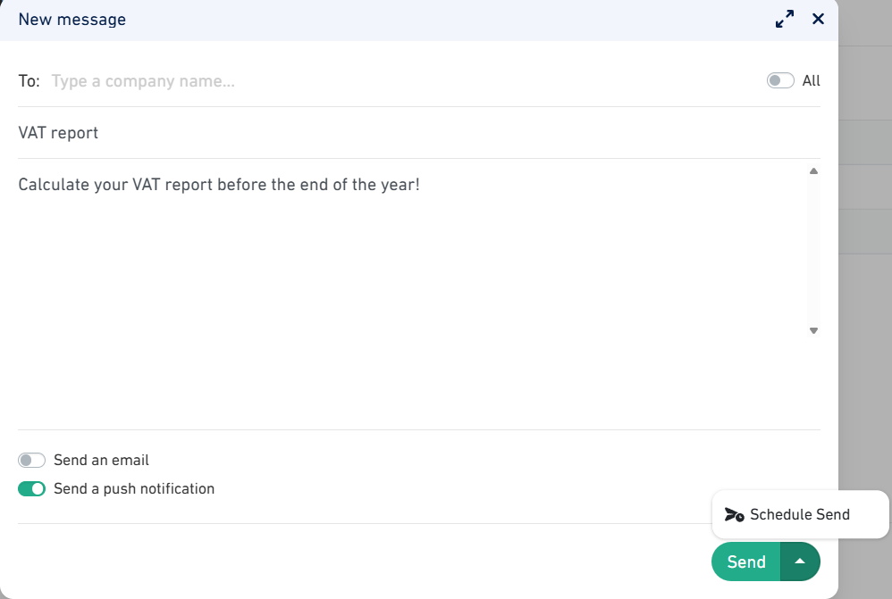 Wanneer je een nieuw bericht aanmaakt, kun je je cliënten zoeken op bedrijfsnaam of e-mailadres. Er is ook een knop rechtsboven om je bericht naar alle cliënten te sturen.